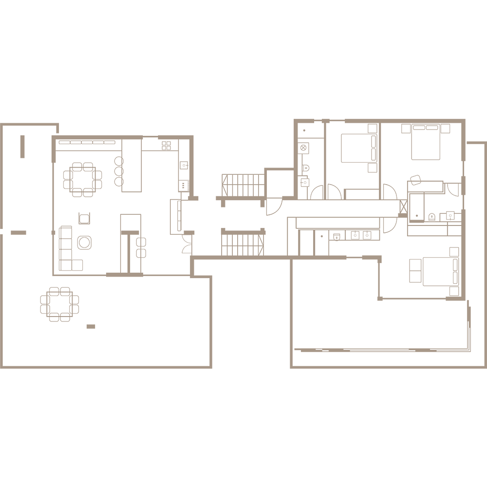Stan posjeduje veliku terasu, izlaz na krov, krovnu terasu i bazen